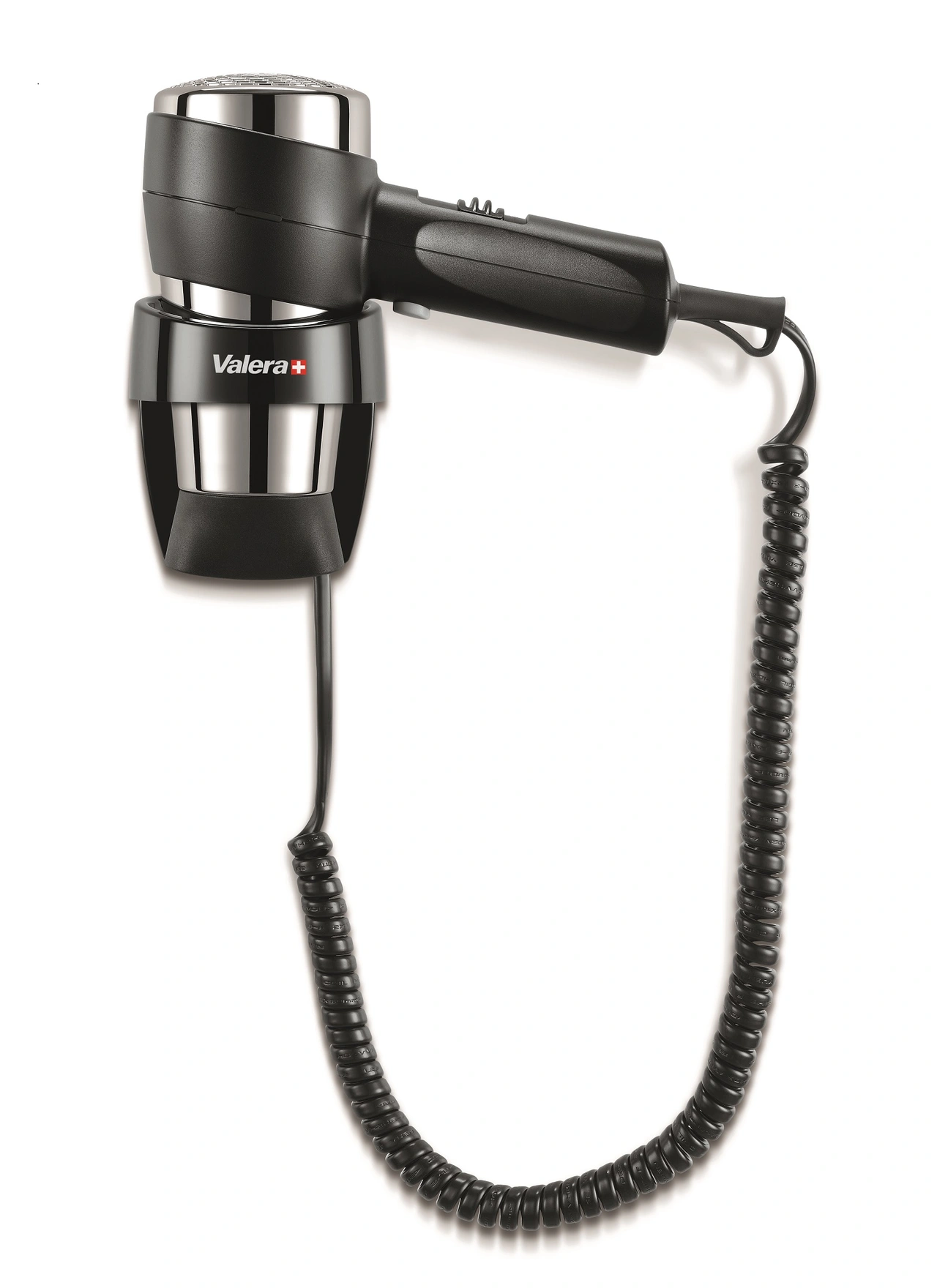 Denna hårtork är avsedd för fast installation. Spiralsladd. Hårtorken har värmeslingor för extra säkerhet. Den har 2 hastigheter, 3 temperaturval. Kalluftfunktion. Koncentrationsmunstycke. On/Off säkerhetsknapp.